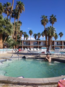 Just up the road, the town of Desert Hot Springs is the dusty underbelly of Palm Springs. Where Palm Springs evokes the retro allure of high-end vintage stores, Desert Hot Springs is more like a Salvation Army, or a thrift store in a church basement. Many of the hot springs resorts are untouched relics of the Rat Pack era, or else they have been transformed into greasy “lifestyle” spas (read: clothing-optional swingers resorts for people too cheap to travel to Jamaica). I’m a fan of the former, not the latter. At one such spa, a gem of mid-century modern architecture, a stretch limo is permanently parked at the curb, adding a degree of glamour to counter the resort’s rundown appearance. Pictures of Dean Martin and Marilyn Monroe hang on the walls – unsigned, because surely the greats never came to a place with mildewed tilework and concrete change-room floors. Nevertheless, spending a day in hot pools amidst the fake-breasted and leather-tanned locals is heaven to me after a few weeks of cold whore’s baths out of my sink.