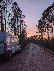 Celebration and Key West are places I have classified as “Good Florida.” Good Florida is what you think of when you imagine Floridian vacations: orange groves as far as the eye can see, palm trees on white sand, and orchids flourishing in the Everglades. Good Florida is beach towns, airboat tours, mid-century modern architecture, fishing charters, golf courses, country clubs, rocket launches, and swimming holes. It is mainly navigable via golf cart. Its main locales include Disney World, the Keys, Miami Beach, spring break parties, and retirement communities where everyone votes Republican. The residents of Good Florida live in timeshare condos or walled suburbs with security guards at the entrance, and ask that you not step on the grass. Good Florida is not accessible to the masses; it has an entrance fee, requires tickets, and recommends booking ahead of time. This is true even for vanlife! Many of the campgrounds I’ve been visiting are gated and locked, even the free ones, and are accessible only if you make an online reservation.